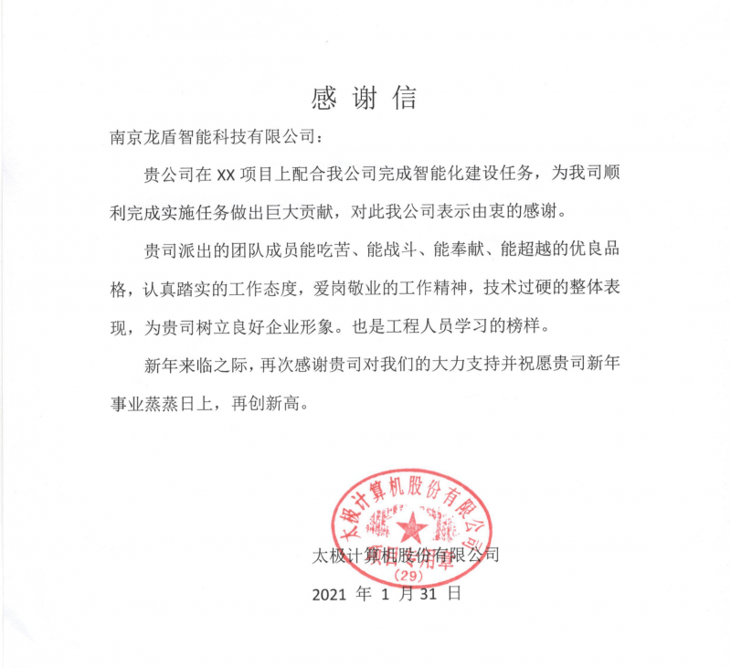 2021年1月31日我司收到來自太極計(jì)算機(jī)股份有限公司的一封感謝信。信中對我司在XX項(xiàng)目中的工作給予了充分的肯定,并致以由衷的感謝。